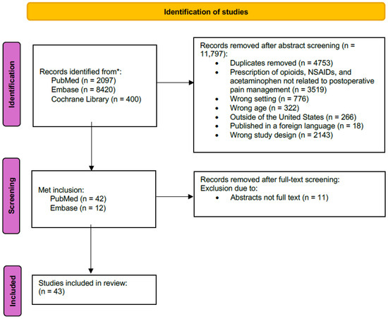 The initial study extraction generated 11,851 studies from PubMed (n = 2097), Embase (n = 8420), and Cochrane Library (n = 400). Studies were excluded if they had to do with the prescription of opioids, NSAIDs, and acetaminophen not related to postoperative pain management (n = 3519), were the wrong setting (n = 776), wrong age (n = 322), outside of the United States (n = 266), published in a foreign language (n = 18), or wrong study design (n = 2143). Duplicated studies were removed (n = 4753). A total of 54 studies met the inclusion criteria from PubMed (n = 42) and Embase (n = 12). An additional 11 studies were excluded following a full study review due to being abstracts and not full text. A total of 43 eligible studies were retained for analysis (Figure 1). The retained studies were published between 2016 and 2023. Most studies (n = 31/43, 72%) were published in the last 5 years. Study designs included retrospective cohort studies (n = 25), prospective cohort studies (n = 8), cross-sectional studies (n = 5), prospective-retrospective cohort studies (n = 2), retrospective case series (n = 1), systematic review (n = 1), and retrospective chart review (n =1). Sample size ranged from n = 58 to n = 852,111. The healthcare settings included academic hospitals (n = 26), outpatient surgical centers (n = 8), both academic medical centers and outpatient surgical facilities (n = 5), research databases (n = 2), and academic community hospitals (n = 2).