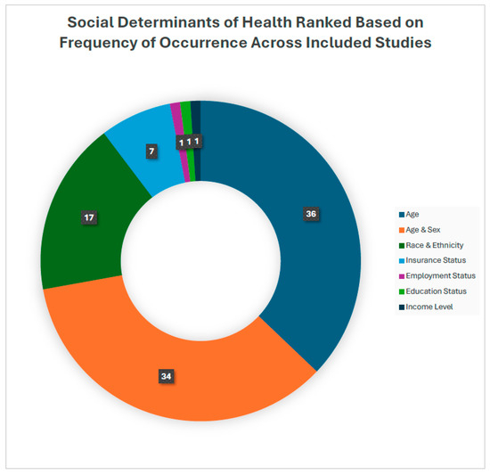 The Healthy People 2030 classification identifies public health priorities to help individuals, organizations, and communities across the United States improve health and well-being. Healthy People 2030 is the organization’s fifth version and was based on 40 years of knowledge and data. Their social determinants of health are defined by five categories: Economic stability, Education Access and Quality, Health Care Access and Quality, Neighborhood and Built Environment, and Social and Community Context. Economic stability focuses on employment programs, career counseling, and childcare opportunities to help people achieve steady employment. The education access and quality objective focuses on helping children do well in school and providing higher quality education. Healthcare access and quality focuses on improving healthcare insurance coverage rates, accessibility to primary care providers, and preventative care. The neighborhood and built environment objective seeks to help improve health and safety in the community through advocacy work at the local, state, and federal levels of government. Finally, social and community context focuses on social support by helping people find safe spaces in their communities. Based on these categories, the SDOH examined in this study were categorized based on the Health People 2030 categories. Healthy People 2030 categories reported by high to low frequency of occurrence were Social and community context (n= 39), Health care access and quality (n = 16), Neighborhood and Built Environment (n = 8), Economic Stability (n = 4), and Education Access and Quality (n = 2) (Figure 2). The highest reported category of SDoH was age (n = 36). A total of 34 articles listed sex and age as SDoH (Table 1). Additional SDoH examined were race/ethnicity (n = 17), insurance (n = 7), employment (n = 1), education (n = 4), and income (n = 1) (Figure 3).