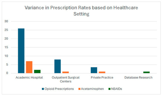 Variance in rates of prescription of Opioids, NSAIDs, and Acetaminophen for postoperative pain management were reported (Table 1). Table 2 highlights the prevalence of prescription of opioids, NSAIDs, and acetaminophen for postoperative pain management across Academic Hospitals, Community Hospitals, and Outpatient surgical centers to focus on differences among these centers.