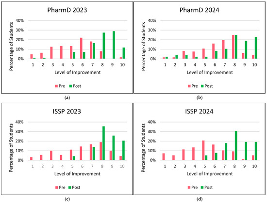 Comparison of student comfort levels for patient counseling pre vs. post activity. Pre-survey data are shown in pink, and post-survey data are shown in green. (a) PharmD 2023; (b) PharmD 2024; (c) ISSP 2023; (d) ISSP 2024.