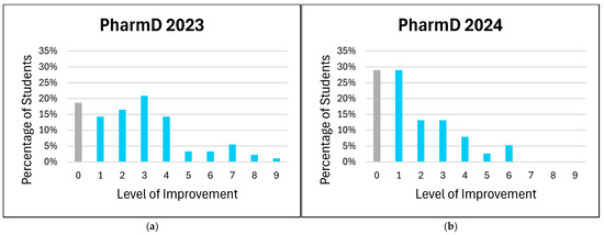 The distribution of improvement levels in students’ comfort with patient counseling on medical devices is shown in Figure 2. In this analysis, all negative values representing non-improvement (i.e., negative changes in comfort level) were aggregated as a value of zero. This approach simplifies the interpretation by considering all instances where no improvement or a decline in comfort occurred as non-improvement. By grouping negative values with zero, we aimed to provide a clearer distinction between students who did and did not show improvement, without overemphasizing minor regressions in comfort levels.
