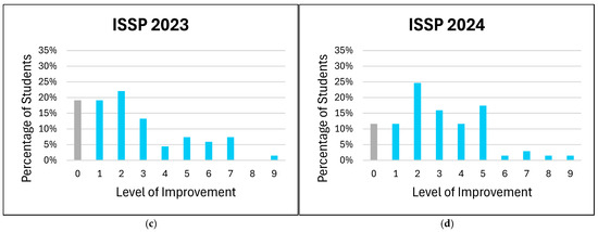 Level of improvement in students’ comfort level for patient counseling on medical devices. The degree of improvement is represented in blue, while no improvement is represented in gray. (a) PharmD 2023; (b) PharmD 2024; (c) ISSP 2023; (d) ISSP 2024.