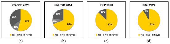 Figure 3 illustrates the percentage of students from the four cohorts who believe that using medical devices enhances information retention when compared to traditional teaching methods. In the PharmD 2023 cohort, the majority of students (54%) answered “Yes”, indicating that they believe medical devices improve information retention; 35% were uncertain (“Maybe”); and a small proportion (11%) felt that medical devices did not offer an advantage over traditional teaching approaches. The PharmD 2024 cohort showed a stronger positive response, with 69% answering “Yes” to improved information retention through medical devices; a smaller percentage of students (23%) were unsure; and 8% believed there was no improvement. The ISSP 2023 cohort showed the highest confidence in the value of teaching with medical devices, with 87% responding “Yes” and only 13% responding “Maybe”. No students in this group responded “No”. Similar to ISSP 2023, in the ISSP 2024 cohort, a large majority (91%) responded “Yes”, supporting the use of medical devices for improved retention, with only 9% unsure. There were also no students who responded “No” in this cohort.