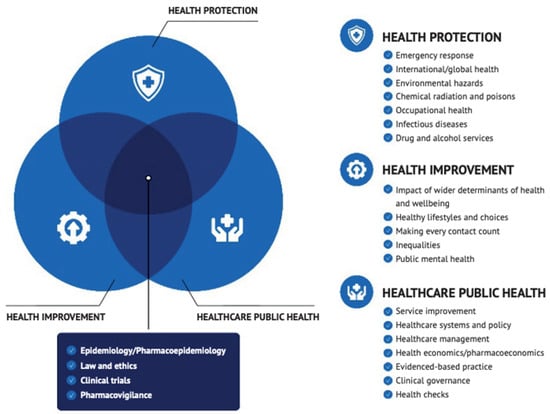 Domains of public health (reproduced with permission from Ashiru-Oredope, Population and public health, Pharmacy Magazine, https://www.pharmacymagazine.co.uk/cpd-modules/population-and-public-health) (accessed on 17 January 2025).
