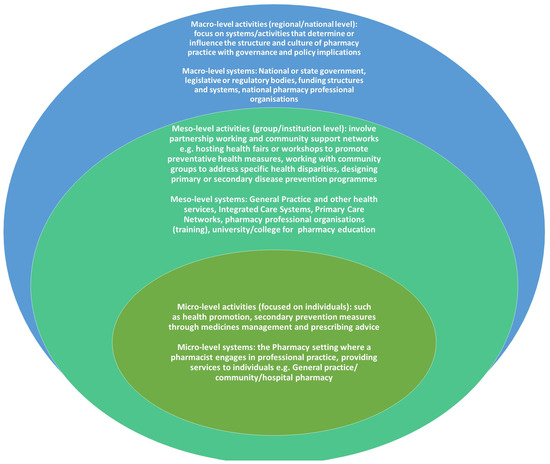 Walker’s observation is still reflected more than 20 years later, with the relatively narrow focus of the literature on PPH. Mulvale and colleagues organised contextual factors as an interrelated set of policy (macro), organisational (meso), team (micro), and individual factors [3]. Over the years, the available literature on the pharmacy professions’ public health function has predominantly focused on the contribution of community pharmacies and pharmacists delivering public health interventions to individuals, through micro-level activities. Examples of these micro-level services include health promotion activities, administering vaccines, educating patients about vaccinations, conducting health screens targeting blood pressure, cholesterol, and weight, or secondary prevention measures through medicinal management and prescribing advice, rather than on population health or broader public health interventions [4]. Community pharmacies are frequently located in some of the most deprived and challenging communities, providing daily contact for individuals seeking ad hoc and unplanned health advice alongside a collection of prescribed medicines or purchasing over-the-counter health-related products [5,6]. In England, there are over 1.2 million daily health-related visits to community pharmacies. This presents an important opportunity to support behavioural change at an individual, micro level. However, there are also opportunities for pharmacy professionals across all sectors to address wider societal aspects of public health at meso- (network or systems through which micro systems interact, usually, e.g., community/organisational-focused) and macro (policy/population-focused) levels [3,5,6]. Examples of meso-level services include hosting health fairs or workshops to promote preventative health measures, working with community groups to address specific health disparities, designing primary or secondary disease-prevention programmes such as weight management, managing chronic disease initiatives across health systems, and advocating or facilitating programmes for low-cost or free medications. At the macro level, examples include advocating for legislation to improve access to medicines or pharmacy services, leading or contributing to policy development on vaccination mandates, conducting studies to assess health outcomes, addressing disparities in pharmaceutical access and outcomes, developing guidelines or educational materials for large populations, or promoting public health in national health departments such as ministries of health, public health bodies (such as UK Health Security Agency, Public Health Wales, and Public Health Scotland (in the UK), Centres for Disease Control such as Africa CDC, US CDC, WHO, or Non-Governmental Organisations.