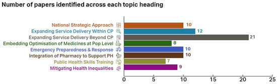 - Stokes, G.; Rees, R.; Khatwa, M.; Stansfield, C.; Burchett, H.; Dickson, K.; Brunton, G.; Thomas, J. Public Health Service Provision by Community Pharmacies: A Systematic Map of Evidence. Available online: https://eppi.ioe.ac.uk/cms/Default.aspx?tabid=3753 (accessed on 28 October 2024).
