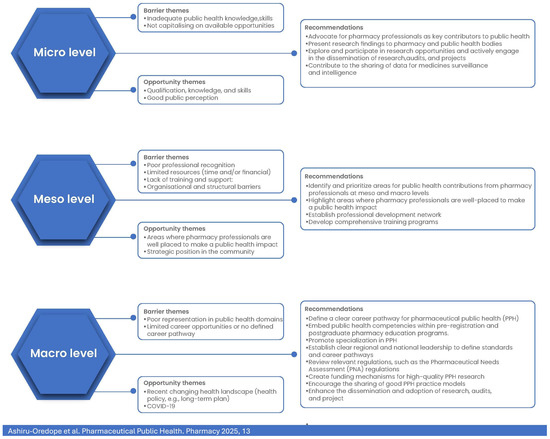 This study highlights the evolving roles of pharmacy professionals in public health beyond micro-level interventions, usually through community pharmacy. It also emphasising the alignment of these roles with global competency frameworks and public health standards. Barriers, opportunities, and recommendations to increase PPH involvement were examined through a socio-institutional framework, considering, macro-, meso- and micro-level factors (summarised in Figure 6). To advance pharmacy professional involvement in PPH, this study recommends focusing on adopting a national strategic approach to pharmaceutical public health, including improving commissioning, formalising pharmaceutical public health workforce development, and promoting evidence based pharmaceutical public health research and development.
