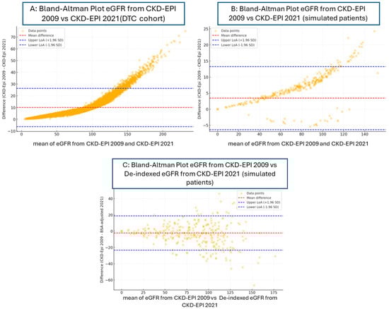 | Bland–Altman Plot | eGFR from CKD-EPI 2009 vs. CKD-EPI 2021 | eGFR from CKD-EPI 2009 vs. CKD-EPI 2021 | eGFR from CKD-EPI 2009 vs. De-Indexed eGFR from CKD-EPI 2021 |
