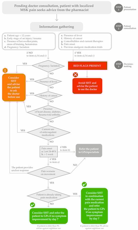 Pharmacists need to be supported to undertake appropriate training so they can better support patients with MSK disorders. To this end, postgraduate training and information tools could be helpful. In everyday practice, pharmacists can benefit from hands-on tools and decisional algorithms specifically developed to provide practical guidance on SHT’s proper application, highlighting specific potentialities as well as contraindications. The decisional algorithm shown in Figure 1 aims to aid pharmacists in counselling patients with MSK pain on using SHT pending a doctor consultation by guiding step by step the pharmacists in red flags identification, patient assessment, and the treatment decision. During this manuscript preparation, the authors were made aware, via an online search, that the International Pharmaceutical Federation (FIP) had just released a guide to support community pharmacists in the dispensing of HT in the management of MSK pain [27]. The actionable suggestions (Table 2) provided in our work are fully in line with the latest FIP recommendations on HT in MSK disorders and complement them by providing a user-friendly workflow to follow by the pharmacists along with a list of patient-friendly questions to ask the patients to attain comprehensive information gathering.
