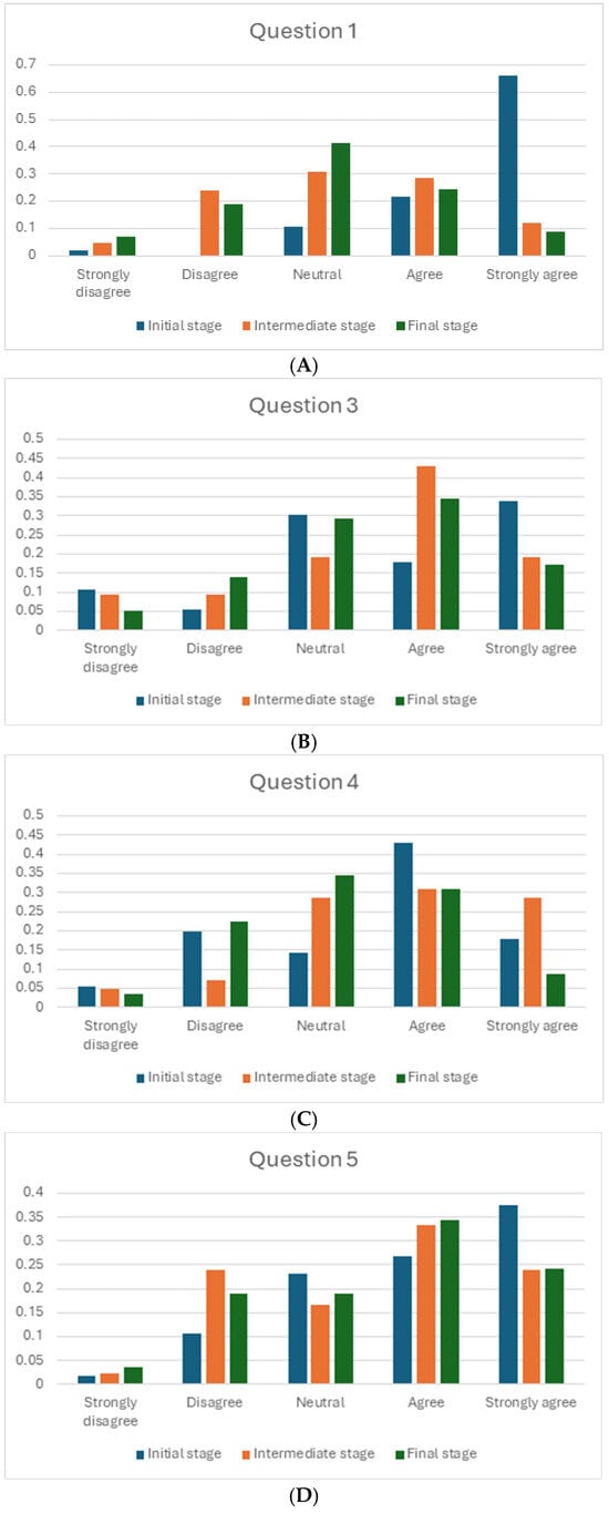Figure 1A–E for questions 1, 3, 4, 5 and 6, respectively. The bar chart illustrates the distribution of responses to the specific question at three different stages: the beginning, the intermediate, and the final phases. The responses are categorized into five levels of agreement: Strongly Disagree, Disagree, Neutral, Agree and Strongly Agree.