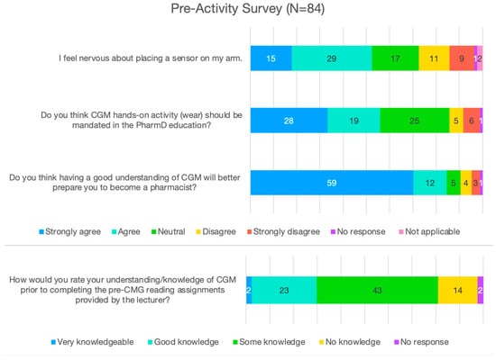 Among those who completed the pre-activity survey (Figure 1), 71 (85%) agreed or strongly agreed that having a good understanding of CGM would better prepare them to become a pharmacist, while 5 (6%) felt indifferent, another 7 (8%) disagreed or strongly disagreed, and 1 (1%) did not provide a rating. When the pharmacy students were asked if CGM-related hands-on activity should be made compulsory in pharmacy education, 47 (56%) agreed or strongly agreed, 25 (30%) felt indifferent, 11 (13%) disagreed or strongly disagreed, and 1 (1%) did not provide a rating. Half of the students (44, 52%) reported having some knowledge about CGM before receiving the hands-on CGM education, while 25 (30%) reported having good or very good knowledge, 14 (17%) reported having no knowledge about CGM, and 1 (1%) did not provide a rating. When the student pharmacists were asked if they felt nervous about attaching a CGM sensor to their arm, 44 (52%) agreed or strongly agreed, 17 (20%) felt indifferent, 20 (24%) disagreed or strongly disagreed, and 3 (4%) did not provide a response or indicated that the question was not applicable.