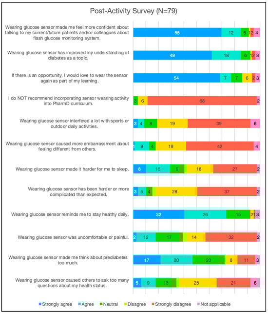 Part of the anonymous, voluntary post-activity survey was adapted and extracted from the Continuous Glucose Monitoring Satisfaction Scale (CGM-SAT) [11], where 11 questions out of the 44-item CGM-SAT questionnaire that focused on satisfaction with the emotional behavioral and cognitive effects of CGM use were included. The post-activity survey consisted of 16 items, which included 4 open-ended questions and 12 Likert scale questions. The open-ended questions asked the pharmacy students to (1) elaborate on the number of days of CGM wear, (2) best and (3) worst part about wearing a CGM over a duration of time, and (4) the relevance of intentionally integrating hands-on CGM education as part of their core pharmacy curriculum. The 12 Likert scale questions asked the pharmacy students to rate their levels of agreement (0 = not applicable, 1 = strongly agree, 2 = agree, 3 = neutral, 4 = disagree, and 5 = strongly disagree) for eight statements related to their experience wearing a CGM sensor, two statements on confidence and understanding of CGM use in diabetes, and two statements on enthusiasm for learning about CGM and the importance of incorporating hands-on CGM education as part of the core pharmacy curriculum.