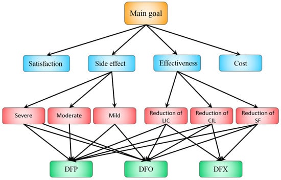 - Determine the side effects of the alternatives and categorize them into three sub-criteria, namely mild, moderate, and severe, for the experts’ evaluation.