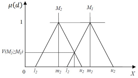 The first, second, and third components of fuzzy numbers are li, mi, and ui. Figure 2 illustrates the comparison of fuzzy sets. M1 = (l1, m1, u1) and M2 = (l2, m2, u2) are two triangular fuzzy numbers, the magnitude of M1 with respect to M2 can be calculated as follows: