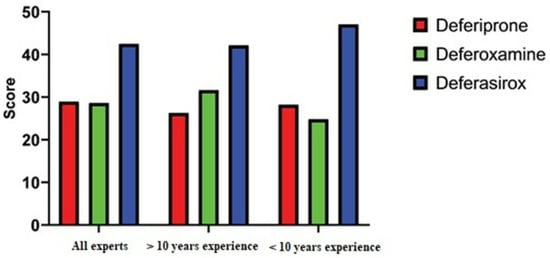 Regarding the views of the two groups, there were some differences in the results obtained from the matrices related to the criteria and sub-criteria of each iron chelator, as shown in Table 6. Regarding effectiveness, DFO and DFP were preferred as the most effective medications by specialists with over or below ten years of experience, respectively. In the sub-criteria of “reduction in cardiac/liver iron load”, specialists with more than ten years of experience gave the most scores to DFP. Meanwhile, DFX received the highest scores in the sub-criterion of “reduction in serum ferritin”. However, the less experienced specialists gave the highest scores to DFO in the criteria.