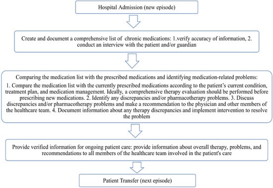 According to recommendations from international organizations, hospitals should implement a structured medication reconciliation process upon admission to reduce the risk of unintentional medication errors and enhance patient safety [8]. The primary goal of medication reconciliation is to ensure that patients continue receiving all necessary medications as intended, while avoiding prescription errors, omissions, therapeutic duplications, and harmful drug–drug or drug–disease interactions [9]. This process should be standardized and initiated as early as possible upon admission, preferably within the first 24 h. Furthermore, all modifications to therapy should be clearly documented, and any discrepancies between the medication history obtained at admission and the current therapeutic plan must be recorded and addressed accordingly (Figure 1) [10].