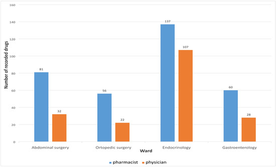 The number of medications recorded by physicians and clinical pharmacists upon admission, across different hospital wards, is presented in Figure 2.