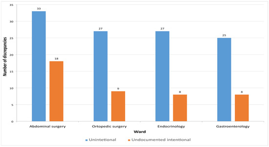 In this study, a total of 155 MDs were identified. Among them, 112 (72.26%) were unintentional, representing incomplete or inaccurate entries on the medication list, while 43 (27.74%) were intentional but undocumented discrepancies that were clinically justified. Figure 3 presents the distribution of unintentional and undocumented intentional discrepancies across the different hospital departments.
