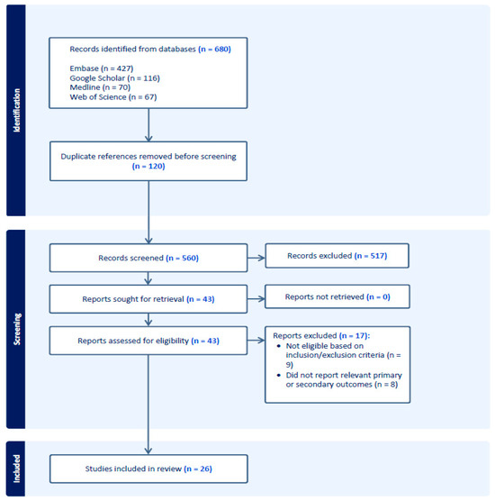 The literature search identified 680 studies, of which 120 duplicates were removed. Following the title and abstract screening, 43 studies were selected for full-text review according to the inclusion and exclusion criteria. A total of 26 studies were included in this review. Studies were excluded for the following reasons: (1) study outcomes did not match our primary/secondary outcomes, or (2) type of study did not meet the criteria. Refer to Figure 1.