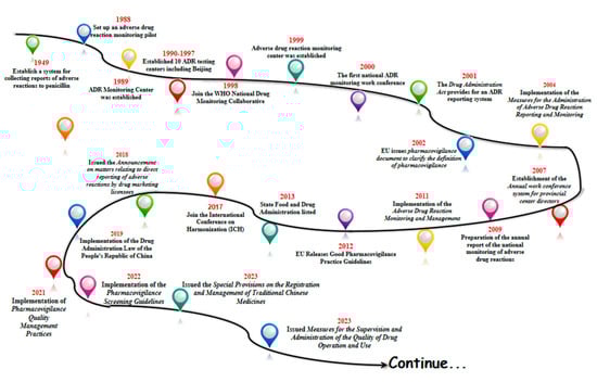 Going through the history of the development of China’s pharmacovigilance, one can see that after the founding of the country and with the start of industrial pharmaceuticals, the state began to strengthen the attention to adverse drug reactions, from only focusing on some areas to establishing an adverse reaction collection system in some hospitals (Figure 1). Furthermore, it carried out pilot studies monitoring adverse drug reactions, formally established of the Adverse Drug Reaction Monitoring Center of the State Drug Administration, promulgated the relevant documents for the monitoring of adverse drug reactions, and formally implemented the “Law of the People’s Republic of China on the Management of Pharmaceuticals”, which can be seen in the whole course of the development of the system of pharmacovigilance in our country. This can be seen from the beginning to the pilot studies to the implementation of the whole course of the development of the system, and at present we are also in a continuous process of improvement and progress.
