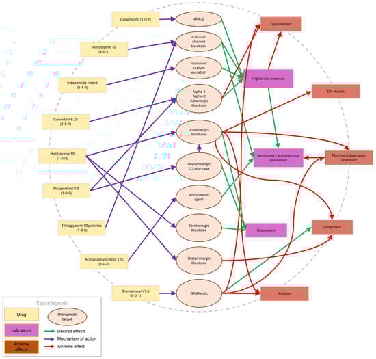 This paper reassesses a previously documented case of a 74-year-old woman with a history of coronary ischemia [8]. Her physician prescribed her an antidepressant treatment because of the death of one of her sons. After three weeks taking the new medication, she began to report significant drowsiness, tiredness, and dry mouth, specifically in the morning. During self-monitoring of blood pressure (BP), she consistently recorded lower-than-usual values (90–110 mmHg systolic BP and 50–65 mmHg diastolic BP). Due to her history of ischemia and cardiac rhythm disorders, such low BP values were considered suboptimal, especially regarding her other symptoms. Given her cardiac rhythm disorders, an electrocardiogram was conducted and evaluated by a cardiologist via telemedicine, confirming widespread T-wave flattening and ventricular extrasystoles. The patient’s drug therapy is detailed in Table 1, which outlines the medications, dosages, and specific therapeutic actions involved.