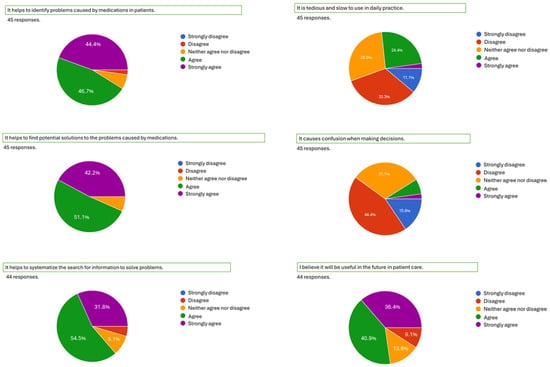 Finally, to assess learning outcomes, each student was required to individually construct and submit a complete systemic map as part of a summative evaluation. This exercise included not only the visual diagram, but also a brief written justification of the pharmacological reasoning behind the map. This multistep process ensured that students were trained not only to interpret systemic maps, but also to create them independently, fostering a deeper integration of theoretical and clinical knowledge. To assess the educational impact of this approach, a survey was conducted at the end of the semester. The aim was to explore students’ perspectives on the use of systemic maps—specifically, whether these tools supported their understanding of pharmacology, enhanced their decision-making skills, aided in solving medication-related problems, and helped them feel better prepared for future patient care. The survey was conducted with 45 students from the 3rd year of the Pharmacy degree program.