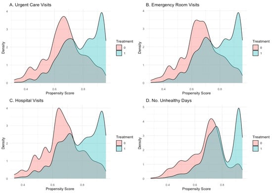 Additionally, we examined self-reported QoL using the CDC’s Healthy Days measure (CDC HRQOL-4) [56,57], which asks respondents to quantify the number of days in the past month they experienced poor physical or mental health. We used this measure in two separate ways. First, it was analyzed as a continuous outcome, representing the total number of unhealthy days per month. Second, we also transformed it into a binary variable, where “0” indicated the patient had fewer than two unhealthy weeks (≤14 days) and “1” indicated the patient had more than two unhealthy weeks (>14 days) in the past month, for use in our healthcare utilization outcome models to aid model specification (i.e., propensity score matching).