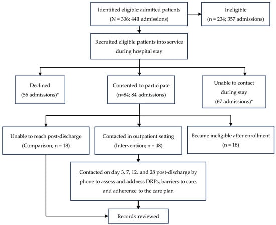The study participation details are outlined in Figure 1. From February 2022 to August 2023, a total of 306 patients, accounting for 441 total admissions, were assessed for eligibility. Of those admissions, 234 (53%) were ineligible due to not meeting multivisit criteria or being transferred or discharged into the care of another medical facility/service. TOC services were declined by the patient or caregiver for 56 admissions, though some patients declining services in a prior admission agreed to utilize the TOC service during a subsequent admission. In 15% of admissions, the TOC pharmacist was not able to make contact with the patient during the admission and was, therefore, unable to recruit the individual to participate in the intervention. There were 84 eligible admissions where the patient agreed to participate, resulting in a final evaluated population of 66 patients due to 18 patients becoming ineligible after service enrollment. This ineligibility was due to the transfer of care to another facility or service. The participants had an average age of 60.1 ± 13.8 years, with 3.3 ± 1.8 admissions and 2.8 ± 4.1 emergency department (ED) visits in the year prior to the admission of service enrollment. There was an even split of male and female patients (50.0%) and the majority were black (66.7%) and had public insurance (78.8%). An average of 5.1 ± 1.8 barriers to care were identified during patient enrollment. There were no significant difference in characteristics for the comparison versus intervention groups (p >0.05). Additional demographics can be found in Table 1.