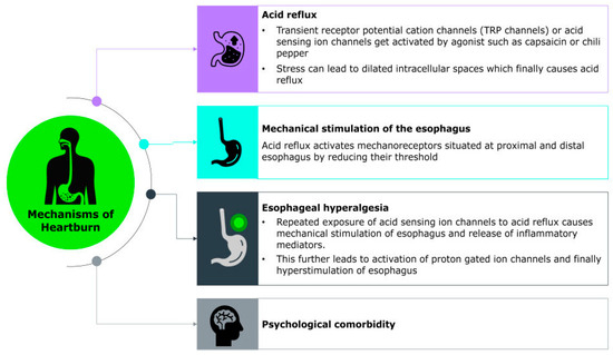 The exact molecular mechanism underlying the sensation of heartburn remains unclear; however, heartburn symptoms are thought to arise from the complex interplay of chemical, mechanical, and neural factors that activate sensory pathways in the esophagus. Recent studies have identified various acid-sensitive ion channels such as transient receptor potential (TRP) channels, acid-sensing ion channels (ASICs), ionotropic purinoreceptor channels (P2X), and acid-sensitive tandem-pore potassium channels (K2P/TASK), as well as chemosensory receptors, expressed within gastrointestinal sensory neurons. These ion channels may contribute to the detection and transmission of noxious stimuli. Additionally, neuropeptide-associated pathways, including those involving substance P and calcitonin gene-related peptide (CGRP), are thought to play a key role in amplifying sensory signaling and promoting inflammation, further sensitizing the esophageal mucosa [60].