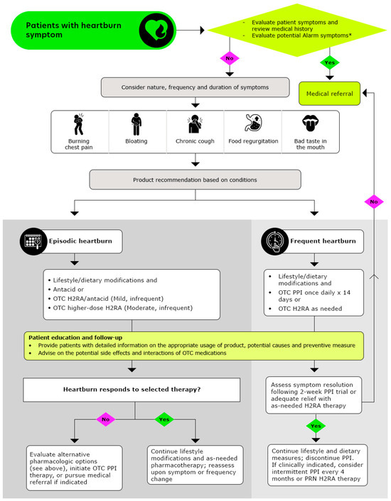 To differentiate between heartburn and GERD or other more serious gastrointestinal conditions, pharmacists may consider referring patients to healthcare providers who may recommend additional clinical diagnostic testing, such as upper GI endoscopy, esophageal manometry, barium swallow studies, pH monitoring, and impedance testing. Such tests are particularly advised for cases unresponsive to OTC treatments, those presenting red flag symptoms (detailed in Table 3), or in complicated or recurrent scenarios [68]. The frequency of symptoms is essential in diagnosing heartburn, as it aids in categorizing the condition as episodic or frequent. Episodic heartburn typically, occurr sporadically (e.g., fewer than two occurrences per week), while frequent heartburn is defined by two or more heartburn episodes per week.