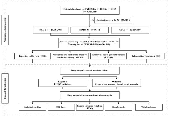 In this study, pharmacovigilance analysis and drug target MR analysis were combined (Figure 1). Pharmacovigilance analysis was pulled from the FAERS to examine the association between PCSK9 inhibitors and memory loss. Based on the pharmacovigilance findings, MR analysis was employed to verify the causal relationship between the PCSK9 inhibitors and memory loss.