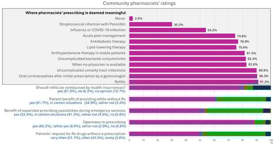 Community pharmacists reported that they were frequently approached by patients requesting the dispensing of prescription-only medicines without a valid prescription. Most community pharmacists expressed a strong interest in an expanded role in prescribing, particularly when supported by point-of-care testing (POCT). The most endorsed scenarios for such a role included the renewal of prescriptions for chronic conditions such as hypertension, atherosclerotic cardiovascular disease (ASCVD), or diabetes, as well as the initiation of treatment for acute conditions such as urinary tract infections or conjunctivitis. Many pharmacists noted that the ability to prescribe would be particularly beneficial during emergency services, such as at night or on weekends. They specifically advocated for the authority to provide refills and for simplified reimbursement procedures. Detailed results of the questionnaire are presented in Figure 1.