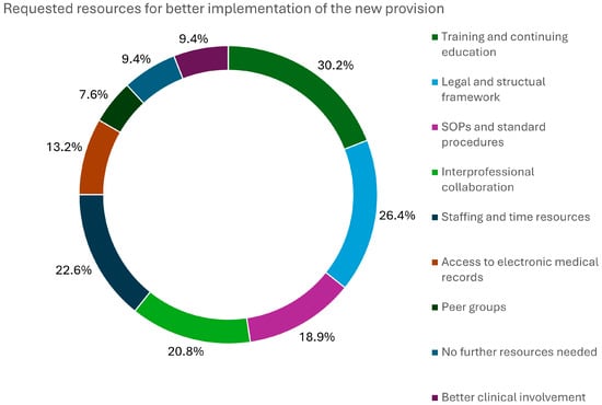 Hospital pharmacists further specified what kind of additional resources they would prefer for a more successful implementation of the new regulations into their hospital setting. Better training and continuing medical education (CME) were chosen by almost every third clinical pharmacist (30.2%), indicating a need for more programs in this field. Clearance of the enhanced competencies by physicians is part of the request for a legal and structural framework (20.4%). The responses are displayed in Figure 3. Multiple resources could be selected.