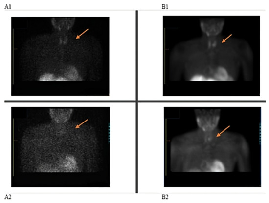 Unexpectedly, the parathyroid scan demonstrated poor tracer uptake in both the early and delayed phases, as was evidenced by compromised contrast on the acquired images. Subsequent application of attenuation correction, coupled with optimization of reconstruction parameters, led to notable improvements in image quality (Figure 1(A1,A2)). Notably, other patients who received doses from the same radiopharmaceutical kit exhibited normal uptake patterns in these tissues, suggesting a patient-specific issue rather than a problem with the radiotracer batch. Further investigation was warranted to determine the cause of the reduced uptake and to ensure accurate diagnosis. The decision was made by the Nuclear Medicine team to repeat the scan two weeks later, with an adjustment to the patient’s medication protocol. Based on the literature, a clinical decision was made for the patient to discontinue all medications for 72 h prior to the date of the rescheduled scan.