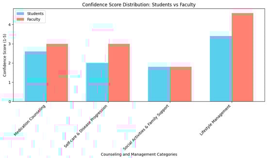 The low confidence reported by students in areas such as medication counseling, self-care strategies, and psychosocial support suggests a need for enhanced curricular content focused on chronic disease management. Prior studies have shown that targeted educational interventions can significantly improve pharmacy students’ clinical competence and confidence in managing complex conditions [14,15]. Faculty responses, while more confident, still reflect uncertainty in key areas, indicating that continuing professional development is equally important.