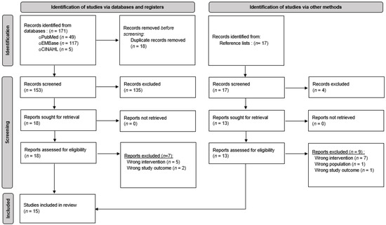A search on the PubMed, CINAHL and Embase databases were performed in January 2025 with four search strings (S1, S2, S3, S4) combined using the Boolean operator “AND” with the following limits set: year of publication 2015–2025. An example of the search and terms used for PubMed, CINAHL and Embase can be found, respectively, in Table A1, Table A2 and Table A3.