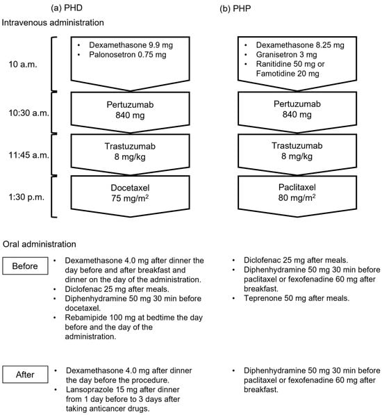 The occurrence of IRRs is significantly suppressed when dexamethasone is administered before TRA []. However, the regimens in that study varied, and some patients were treated with taxanes in addition to TRA. Supportive care drugs during PHD therapy can effectively suppress DTX-induced allergies when administered before PER and TRA infusion [,]. Thus, supportive care medications are not standardized, and their association with IRR and allergy development in PHD and PHP therapies remains unclear.