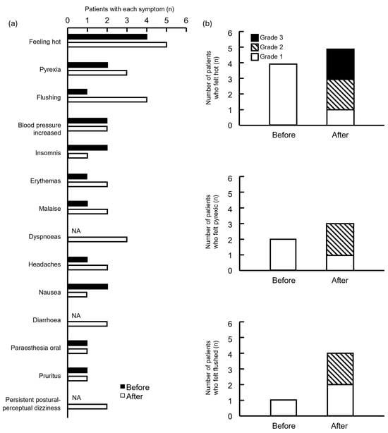 Number of symptomatic side effects in patients treated before and after supportive care drugs were modified. (a) Patients and symptoms; (b) number of patients who felt hot, pyrexic, and flushed. NA, not applicable. Grade indicates the highest grade of symptoms exhibited by each patient.