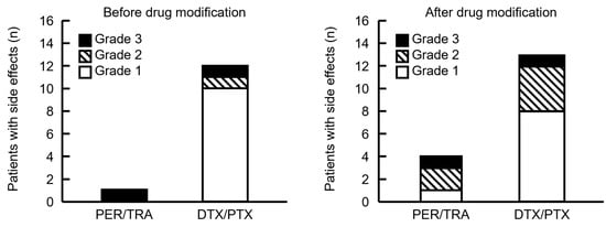 We found that the frequency of side effects and their severity did not significantly differ before and after drug modification. These results suggest that safety can be guaranteed even if some supportive care drugs are discontinued. The frequency of IRR might have been higher than previous findings because we included all events other than constipation, which could not be ruled out as being causally related to the administration of PER, TRA, DTX, and PTX [,,,,,,,,].