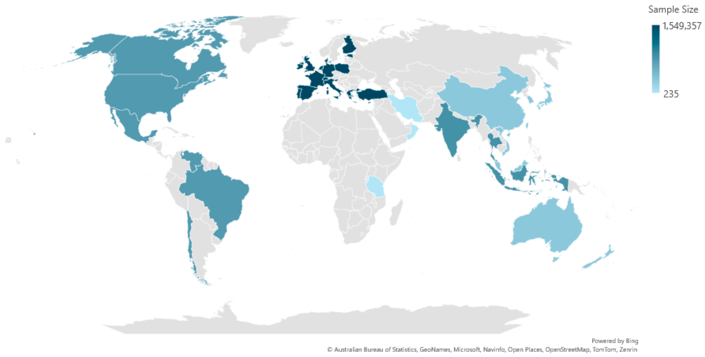 The 223 studies were conducted across 39 countries [25,26,27,28,29,30,31,32,33,34,35,36,37,38,39,40,41,42,43,44,45,46,47,48,49,50,51,52,53,54,55,56,57,58,59,60,61,62,63,64,65,66,67,68,69,70,71,72,73,74,75,76,77,78,79,80,81,82,83,84,85,86,87,88,89,90,91,92,93,94,95,96,97,98,99,100,101,102,103,104,105,106,107,108,109,110,111,112,113,114,115,116,117,118,119,120,121,122,123,124,125,126,127,128,129,130,131,132,133,134,135,136,137,138,139,140,141,142,143,144,145,146,147,148,149,150,151,152,153,154,155,156,157,158,159,160,161,162,163,164,165,166,167,168,169,170,171,172,173,174,175,176,177,178,179,180,181,182,183,184,185,186,187,188,189,190,191,192,193,194,195,196,197,198,199,200,201,202,203,204,205,206,207,208,209,210,211,212,213,214,215,216,217,218,219,220,221,222,223,224,225,226,227,228,229,230,231,232,233,234,235,236,237,238,239,240,241,242,243,244,245,246,247,248,249,250,251,252,253,254]. The characteristics of the included studies are summarized in Supplementary Table S3. The studies have been divided into different regions as follows: 41 studies were conducted in North and South America ([25,31,32,37,45,50,53,57,64,69,71,74,75,77,84,86,90,98,104,108,109,112,115,123,126,132,134,143,162,164,167,170,175,195,196,210,216,223,224,244]), 6 studies in the Middle East ([34,106]), 106 studies in Europe ([26,27,28,29,30,33,35,37,39,41,43,47,51,55,59,60,62,65,66,72,76,78,79,81,85,91,96,99,100,103,105,106,107,111,114,116,117,118,119,120,121,124,125,127,130,131,133,135,136,137,142,146,147,150,151,152,153,154,156,158,159,160,161,165,166,168,173,177,179,180,181,183,185,187,188,190,192,194,197,200,203,204,205,206,208,209,211,213,217,219,225,226,229,233,235,238,239,241,242,243,245,247,250,251,254]), 11 studies in Southeast Asia ([42,128,138,140,145,155,191,199,212,220,246]), 56 studies in the Western Pacific ([36,40,44,46,58,61,63,67,68,80,82,83,87,88,92,95,102,113,122,129,139,144,149,157,163,169,171,172,176,178,186,189,193,198,201,202,207,214,215,218,221,230,231,232,234,236,237,240,248,249,252,253]), 1 study in Africa [89], and 2 studies in Australia and the USA ([70,93]). Figure 2 illustrates the heatmap showing the distribution of studies collected in this scoping review by region and sample size. A total of 202 studies included both women and men ([25,26,27,28,29,30,31,32,33,34,35,36,37,38,39,41,42,44,45,46,47,48,49,50,51,52,53,54,55,56,57,58,59,60,61,62,64,65,66,67,68,69,70,71,72,73,74,75,76,77,78,79,80,81,84,85,86,87,88,89,90,91,92,93,94,95,96,97,98,99,100,101,102,103,104,105,106,107,108,109,110,111,112,113,114,115,116,117,118,119,120,121,122,123,124,125,126,127,128,129,130,131,132,133,134,135,136,137,138,140,141,142,143,144,145,146,147,148,150,151,152,153,154,155,156,157,158,160,161,162,163,165,166,167,168,169,170,171,172,173,174,175,176,177,178,179,180,181,182,183,185,186,187,188,189,190,191,192,193,194,195,196,197,198,199,200,201,202,203,204,205,206,207,208,209,210,211,212,213,215,216,217,219,220,221,224,225,226,227,228,229,230,231,232,233,234,235,236,237,238,239,240,241,242,243,244,245,246,247,248,249,250,251,252,253,254]); however, seven studies have only included female populations ([40,149,164,186,223,224,249]) and ten studies only included male populations ([43,63,82,83,139,159,184,214,218,222]). Among the studies, 120 were cross-sectional studies ([25,27,28,29,30,31,32,34,36,38,41,42,44,45,50,55,58,61,64,65,68,69,71,72,73,75,77,78,81,84,86,89,94,95,99,100,102,105,107,109,110,111,112,113,115,123,124,125,128,130,131,133,138,139,140,142,143,144,145,148,149,151,154,155,158,160,161,162,167,171,173,175,177,179,180,182,185,187,189,192,193,196,197,198,199,200,201,203,204,206,208,212,213,214,215,216,217,218,219,221,224,225,228,229,231,232,233,234,239,240,242,243,244,247,248,250,251,252,253]), 31 studies were prospective cohort studies, ([40,46,51,57,63,66,67,82,83,85,91,121,132,134,156,157,164,170,178,184,186,188,202,205,207,211,220,222,226,230,236,245]), 18 studies were secondary analyses of a cohort study ([25,33,37,47,63,76,80,88,116,118,126,135,144,152,159,163,183,190,191,223,237]), 6 studies were randomized controlled trials ([70,98,127,150,166,172]), 5 studies were secondary analyses of a trial, ([79,92,93,106,117]), 13 studies were longitudinal studies ([26,59,74,101,104,122,129,136,147,169,181,210,246]), 20 studies were retrospective cohort studies ([39,43,53,60,62,87,114,120,153,165,168,176,194,195,209,227,235,238,241,249]), 3 studies were case–control studies ([56,137,146]), and 1 study was a quasi-experimental uncontrolled pre–post [96]; one each was a randomized, unblinded noninferiority trial [103], repeated cross-sectional cohort study [254], quasi-experimental pre–post test design [90], retrospective pre–post study [108], cluster randomized trial [35], and pilot study [119].