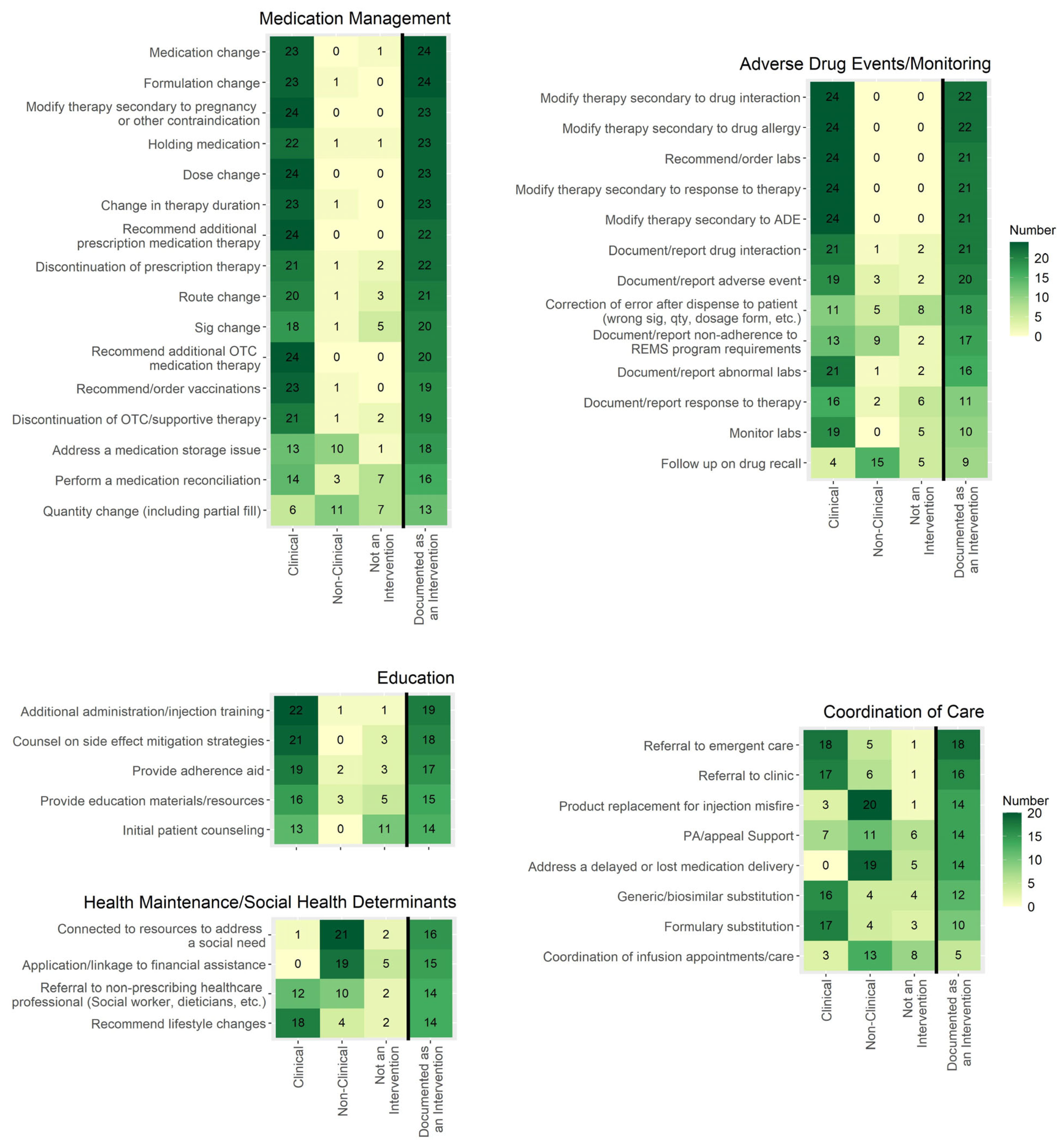 Figure 1. The frequency at which respondents considered tasks to be a clinical intervention, a non-clinical intervention, or not an intervention is shown in the first three columns, which are not mutually exclusive. The far-right column is mutually exclusive and shows how often respondents document these tasks as an intervention in current practice. Cells with a darker color indicate a higher frequency. Sample size n = 24. ADE = adverse drug event; OTC = over the counter; REMS = risk evaluation and mitigation strategy.