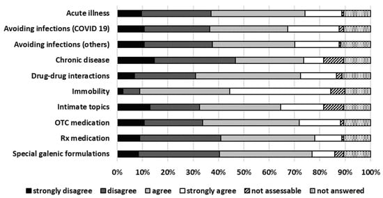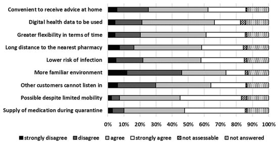 The five most strongly agreed and agreed arguments for TPC were “possible despite limited mobility”, “supply of medication during quarantine”, “long distance to the nearest pharmacy”, “greater flexibility in terms of time”, and “lower risk of infection”. Details about arguments for TPC are presented in Figure 2.