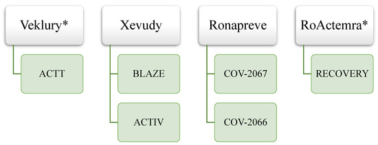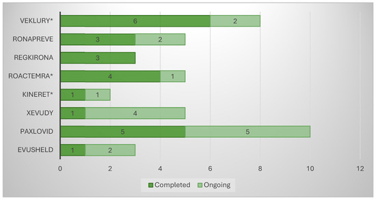 Comparison between the clinical programs of repurposed and innovative drugs also underlines the importance of academia and nonprofit organizations in repurposing. It is important to note that all clinical trials with anakinra were sponsored by an organization other than a pharmaceutical company (the Hellenic Institute for the Study of Sepsis), whereas the CT with the largest number of patients in remdesivir (RECOVERY) was sponsored by Oxford University. In contrast, the clinical program of innovative drugs is almost entirely sponsored by pharmaceutical companies. The only exception is the ACTIV-3-TICO trial for sotrovimab, which received public and private funding, with a design using a master protocol incorporating several subtests with different characteristics. This phenomenon was confirmed by Greenblatt et al., who showed that industry sponsorship played a limited role in supporting drug repurposing in the COVID-19 pandemic. Most of the sponsorship for clinical trials of repurposed drugs came from academic institutions, especially for drugs with generic competitors already on the market [25].
