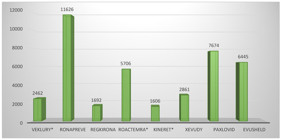 The analysis of EPARs showed that the authorized medicines for treatment of COVID-19 comprised one RNA polymerase inhibitor (remdesivir), one interleukin-1 receptor antagonist (anakinra), one combination of antivirals (PF-07321332/ritonavir), three monoclonal antibodies (regdanvimab, tocilizumab, and sotrovimab), and two combinations of monoclonal antibodies (casirivimab/imdevimab and tixagevimab/cilgavimab).