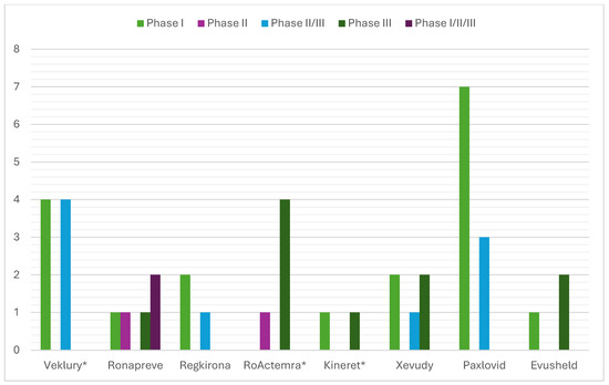 The analysis of the “Clinical aspects” section of the scientific discussion showed that the drug product with the lowest number of conducted clinical trials (CTs) was anakinra (two), where a COVID-19-related indication was added through repurposing (Figure 1). The other product using this approach, tocilizumab, showed five conducted CTs, on par with casirivimab/imdevimab and sotrovimab. Unlike the latter, however, the repositioned product submitted dominantly completed CTs (4/5 or 80%), while the innovative drugs reported 3/5 or 60% and 1/5 or 20%, respectively. A total of eight CTs were included in the EPAR of the third repositioned representative, remdesivir. Although this is a large number, it should be noted that 4/8 or 50% of them were conducted in the period of 2015–2019 and were phase I CTs to assess the safety, tolerability, metabolism, excretion, and pharmacokinetics of remdesivir. For this reason, remdesivir is classified as a repositioned medicinal product, as these are already accumulated data. However, it was necessary to include it in the submission due to the absence of a marketing authorization at the time of issuing the EPAR. For the clinical aspects section, the total number of subjects in clinical trials was another important parameter, part of the EPAR analysis. Again, anakinra showed the smallest number of participants (1606) compared with the other repositioned products, remdesivir and tocilizumab, ranking third (2462) and fifth (5706), respectively, in terms of the number of subjects enrolled in the clinical program (Figure 2). Analysis of the clinical trials distribution by phases also provided evidence of the effect of repositioning. For innovative products, there was a dominance of initial phases, such as phase I (particularly pronounced for PF-07321332/ritonavir and regdanvimab), as these therapies have not been authorized for use and need to provide positive data to demonstrate tolerability (Figure 3). For the repositioned product tocilizumab, there was a dominance of phase III CTs. This demonstrates the effect of using a proven-safe product, which does not require conducting additional phase 1 safety and tolerability trials. For anakinra, only one phase I trial was conducted to collect data in the new indication, and this result was consistent with tixagevimab/cilgavimab and casirivimab/imdevimab. In addition, although four phase I CTs for remdesivir were included in the EPAR, their aim was to demonstrate the safety and tolerability of the molecule in general rather than specifically in the indication associated with COVID-19.