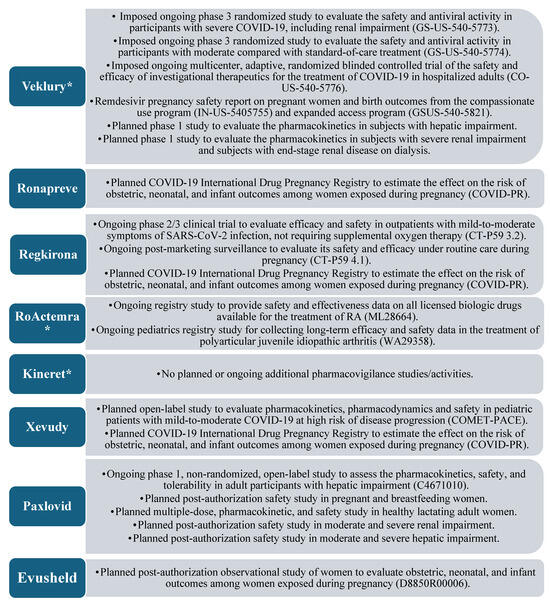 The comparative analysis of the clinical safety section of the EPAR strongly indicated the impact of repositioning as a method of drug development and the use of medicinal products that are proven to be safe. Anakinra showed a total absence of additional studies, part of the pharmacovigilance plan, and tocilizumab showed two non-interventional studies (NISs) of the registry type, which were intended to research drug safety information for use in diseases other than SARS-CoV-2 infection. These two observations provide evidence of the clear advantage of extending the application of a product with an established use, as there are usually no imposed additional drug safety-monitoring activities, nor activities specific to the new indication. Additional activities are listed in the EPARs of all other products, and in most cases, these represent NISs (registry type). It is also important to note that pregnancy use studies are planned or underway for all remaining drugs, once again demonstrating the small amount of information collected in the course of CTs for this population, also mentioned by Vousden and colleagues [30]. Thus, in an urgent health crisis, repositioning may emerge as the drug development strategy of choice in similar populations for which a sufficient amount of data is not traditionally collected in CTs.