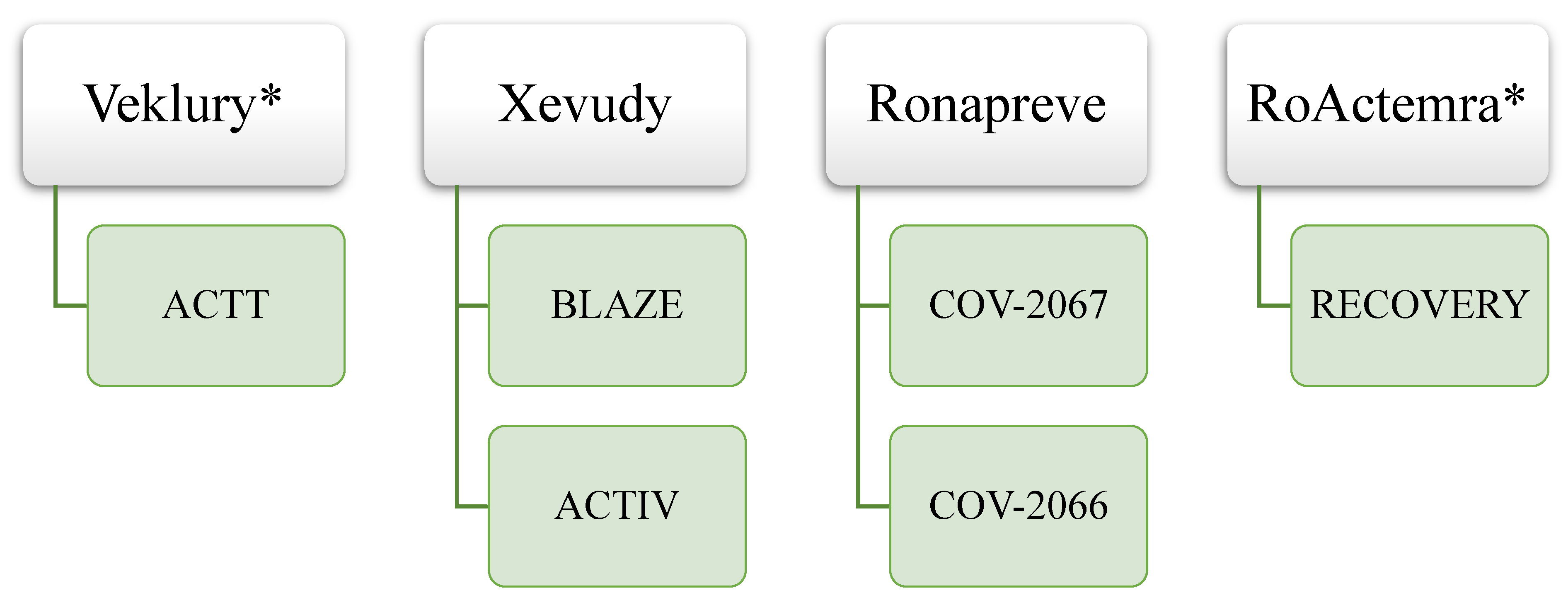 Comparison between the clinical programs of repurposed and innovative drugs also underlines the importance of academia and nonprofit organizations in repurposing. It is important to note that all clinical trials with anakinra were sponsored by an organization other than a pharmaceutical company (the Hellenic Institute for the Study of Sepsis), whereas the CT with the largest number of patients in remdesivir (RECOVERY) was sponsored by Oxford University. In contrast, the clinical program of innovative drugs is almost entirely sponsored by pharmaceutical companies. The only exception is the ACTIV-3-TICO trial for sotrovimab, which received public and private funding, with a design using a master protocol incorporating several subtests with different characteristics. This phenomenon was confirmed by Greenblatt et al., who showed that industry sponsorship played a limited role in supporting drug repurposing in the COVID-19 pandemic. Most of the sponsorship for clinical trials of repurposed drugs came from academic institutions, especially for drugs with generic competitors already on the market [