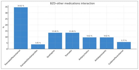 Opioid medications account for 61.55% of all interactions detected in patients using BZDs. Tramadol, alone or in combination, accounts for 48.09% of all BZD–other medication interactions and 66.67% of all BZD–opioid interactions. The major opioid group (tapentadol, fentanyl, buprenorphine/naloxone) accounts for 13.46% of interactions detected in patients treated with BZDs. Other relevant interactions observed are those between BZD and quetiapine (13.46%), antipsychotics (9.62%), antidepressants (9.62%), and codeine/paracetamol (5.77%) (Figure 1).