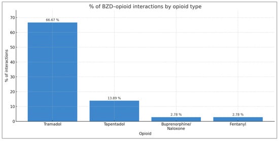 When the same comparison is made with BZD–opioid interactions by type, it can be seen that the opioid that causes the most interactions with BZD is tramadol (66.67% of all BZD–opioid interactions), followed by tapentadol (13.89%), buprenorphine/naloxone (2.78%), and fentanyl (2.78%) (Figure 2).