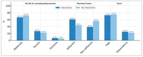 Results of the EQ-5D-5L (anxiety/depression dimension), Morisky–Green, and Tyrer tests in the two groups of Benzodiazepine-using patients studied (patients with detected interactions and without detected interactions due to Benzodiazepines).